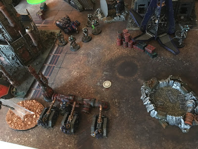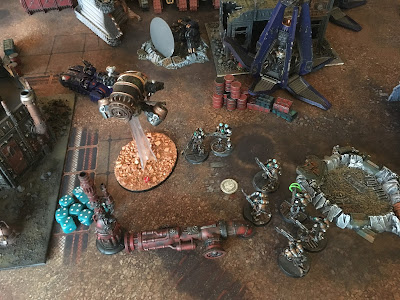 meanwhile his thanatars rained plasma mortars over my terror marines in cover, forcing me to re-roll succesfull cover saves, decimating them to the extent that even my hardened killer balked at their losses. But they kept. His vulturax turned on it's mechadendtrites and charged my marines.