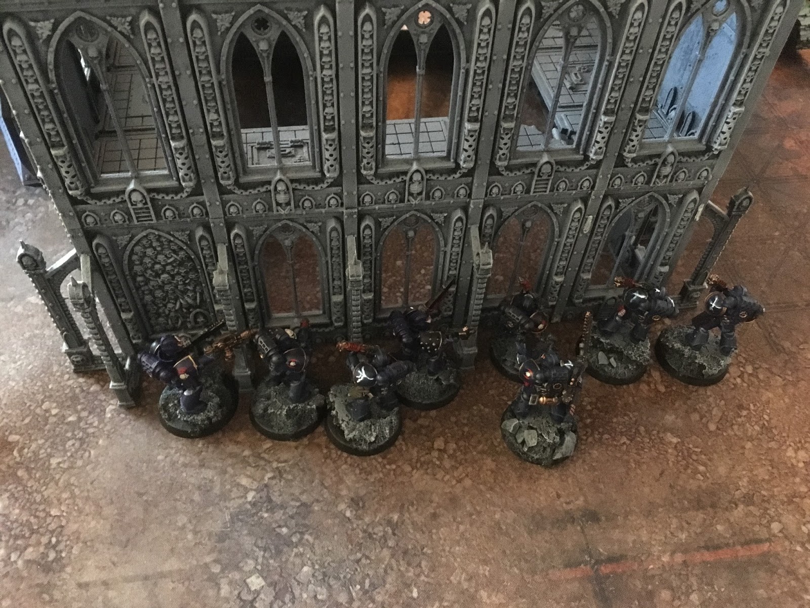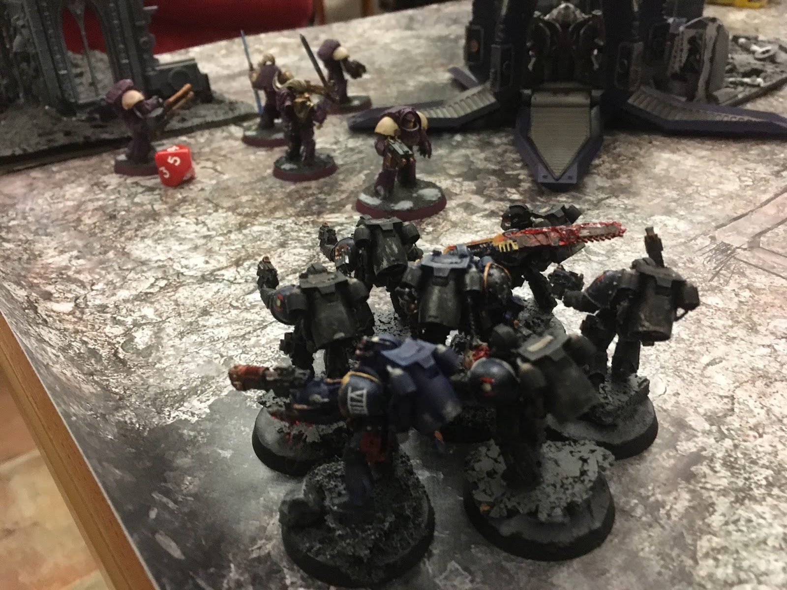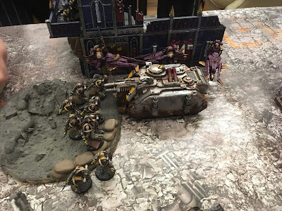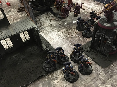 Leaping from their droppod they opened fire into the ruins and killed seven marines, the rest fleeing six inches off the board.