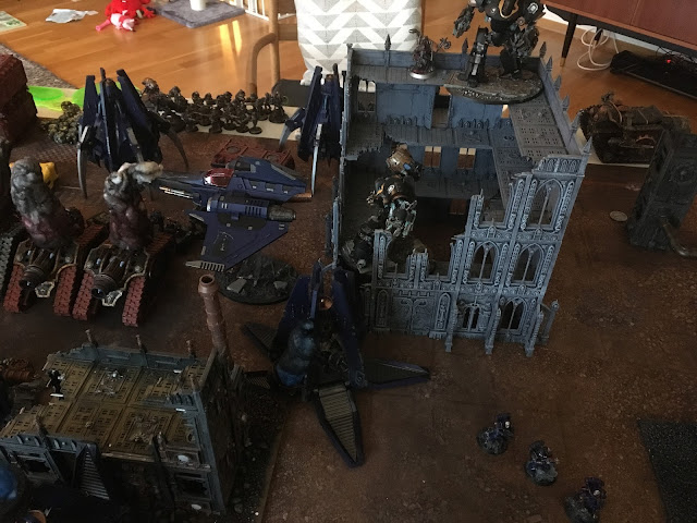 My rapiers round out by shooting graviton shots at this transport, managing to create difficult and dangerous terrain. While also trying to tie up his thallaxii (forgetting that they are JET-pack, and not JUMP pack creatures)