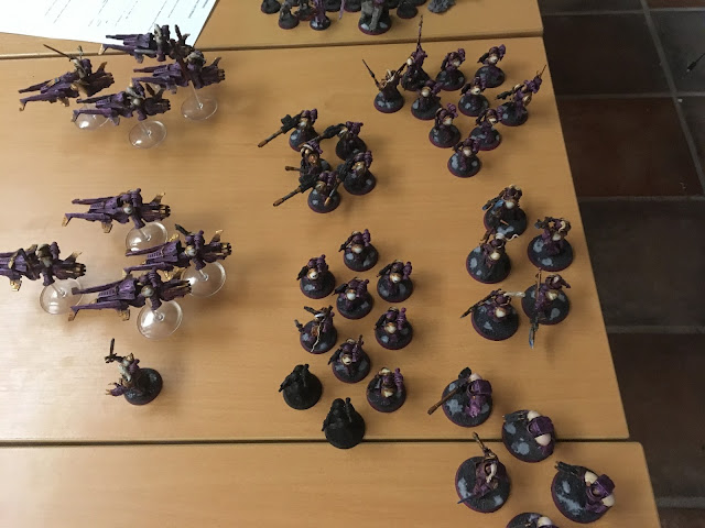 He starts shooting with his thanatars, krios venators, and the majority of his army, My rapiers are T7 and i get a 2+ cover save, meaning that they took a single wound. My scimitars lost two models, but the sergeant persevered ( just
