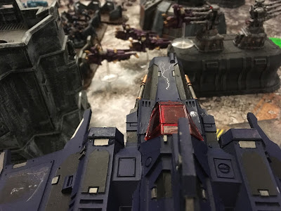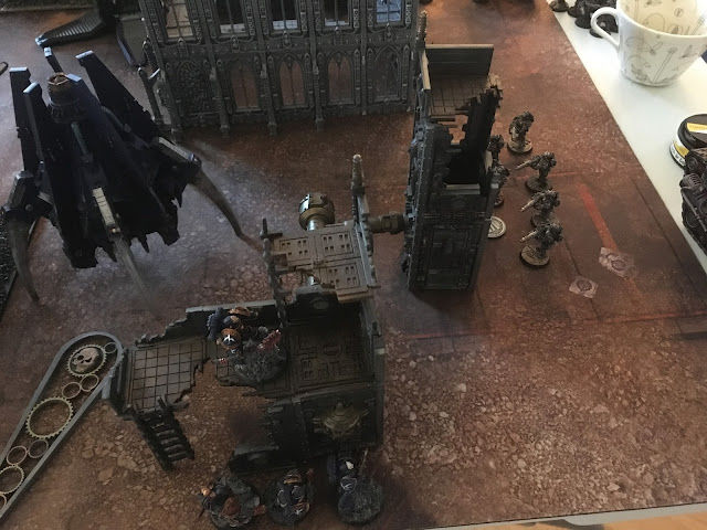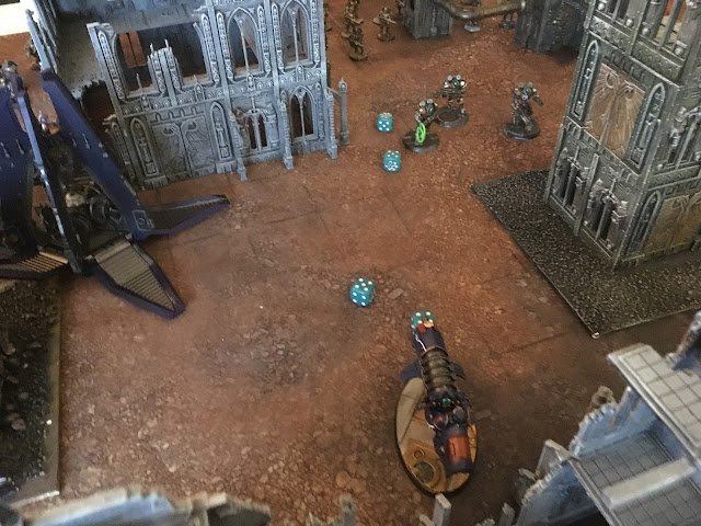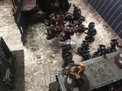 The Scimitar sergeant sped out of the ruins taking full charge at the thallaxii, shooting it's heavy bolters and hitting them, doing two wounds. And then failing a charge at the thallaxii, but ignoring their archaic lightning.