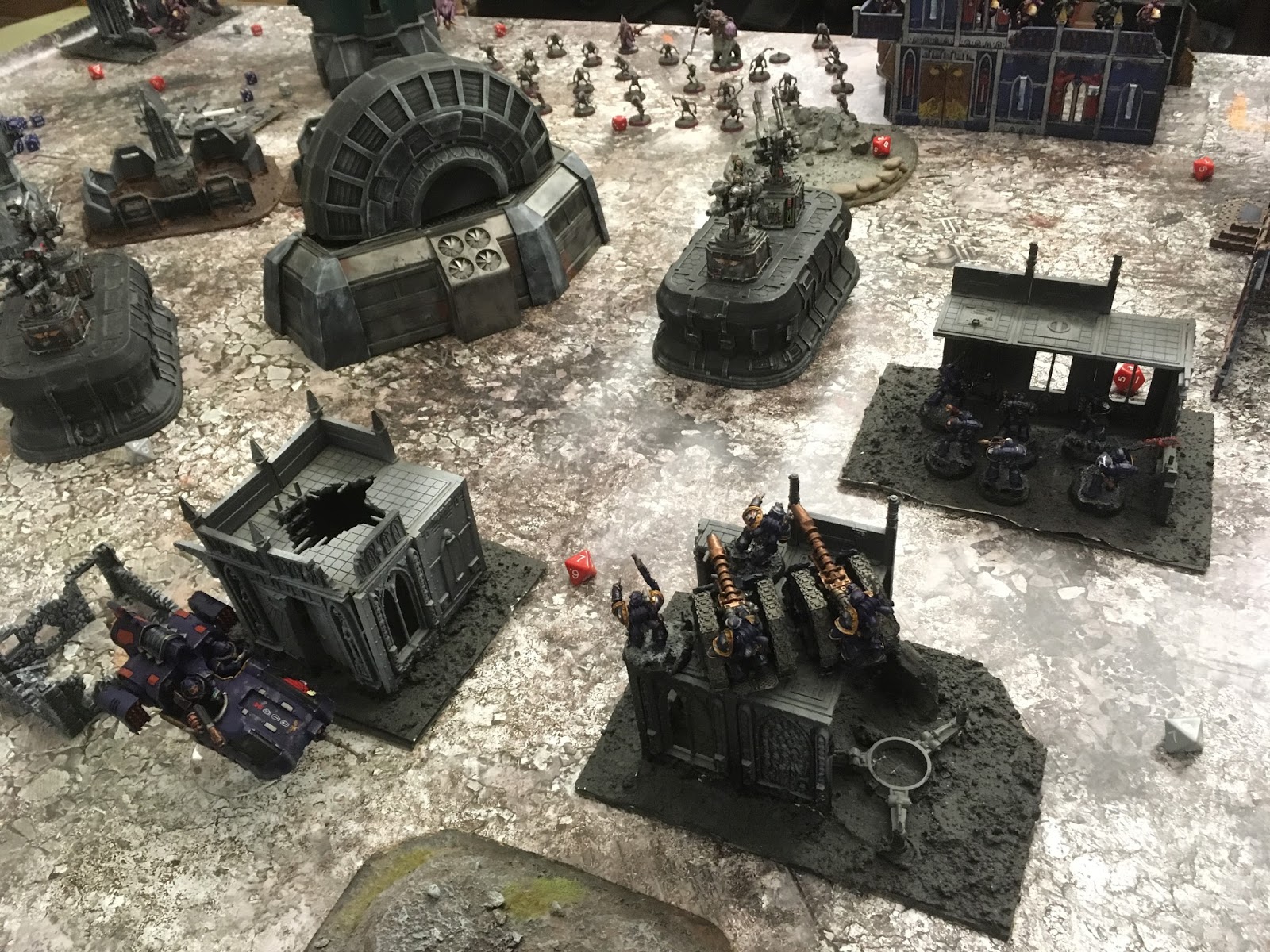 The remnants of the terror marines flee, while the ones holding an objective is now struck by a S7 AP2 large blast, wiping them out to a man and incinerating their apothecary as he is egging a man into action.