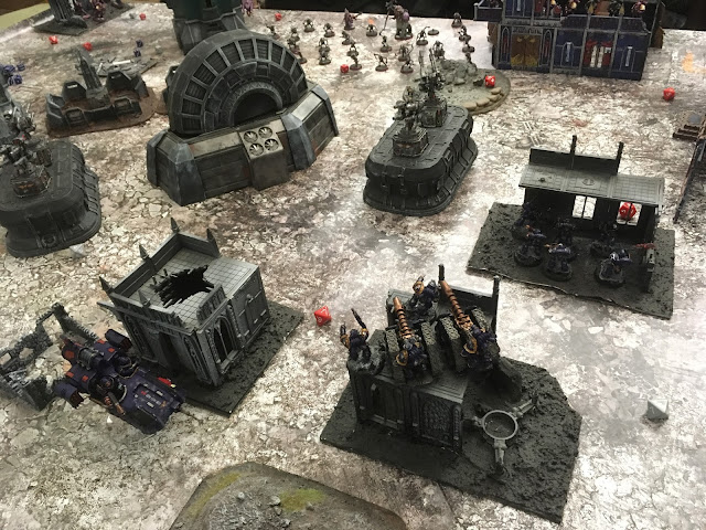 On the right flank fighting continued as my outflanking squad of terror marines came running in and shooting volkite chargers at the entrenched terminators and clearing the ruins with flamers.
