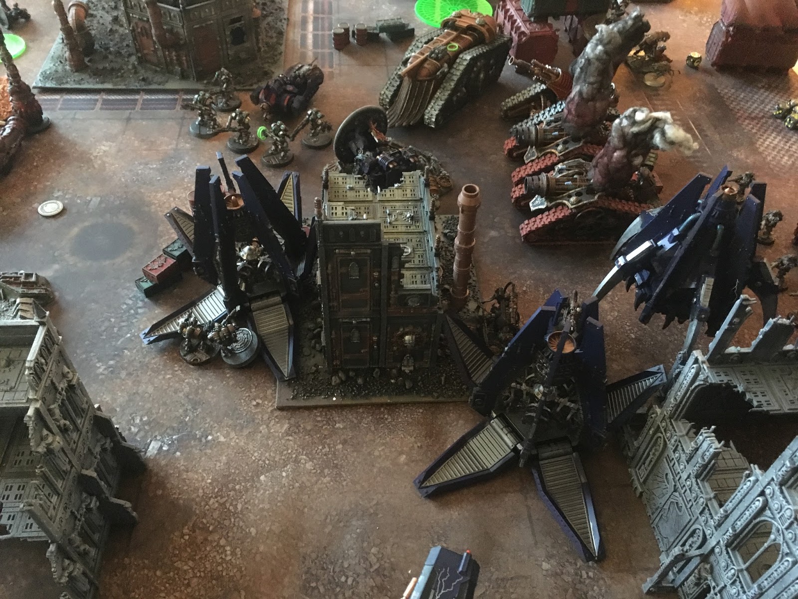 He had two lighting cannon artillery tanks (S7 AP2 large blast) and two anti tank (s9 AP2 heavy 2) two thanatars with plasma mortars (reroll succesfull covesaves S7 AP2) with his HQ magos(lachrymallus meaning that if a thrall squad dies he gets them back on a 5+), and one vulturax