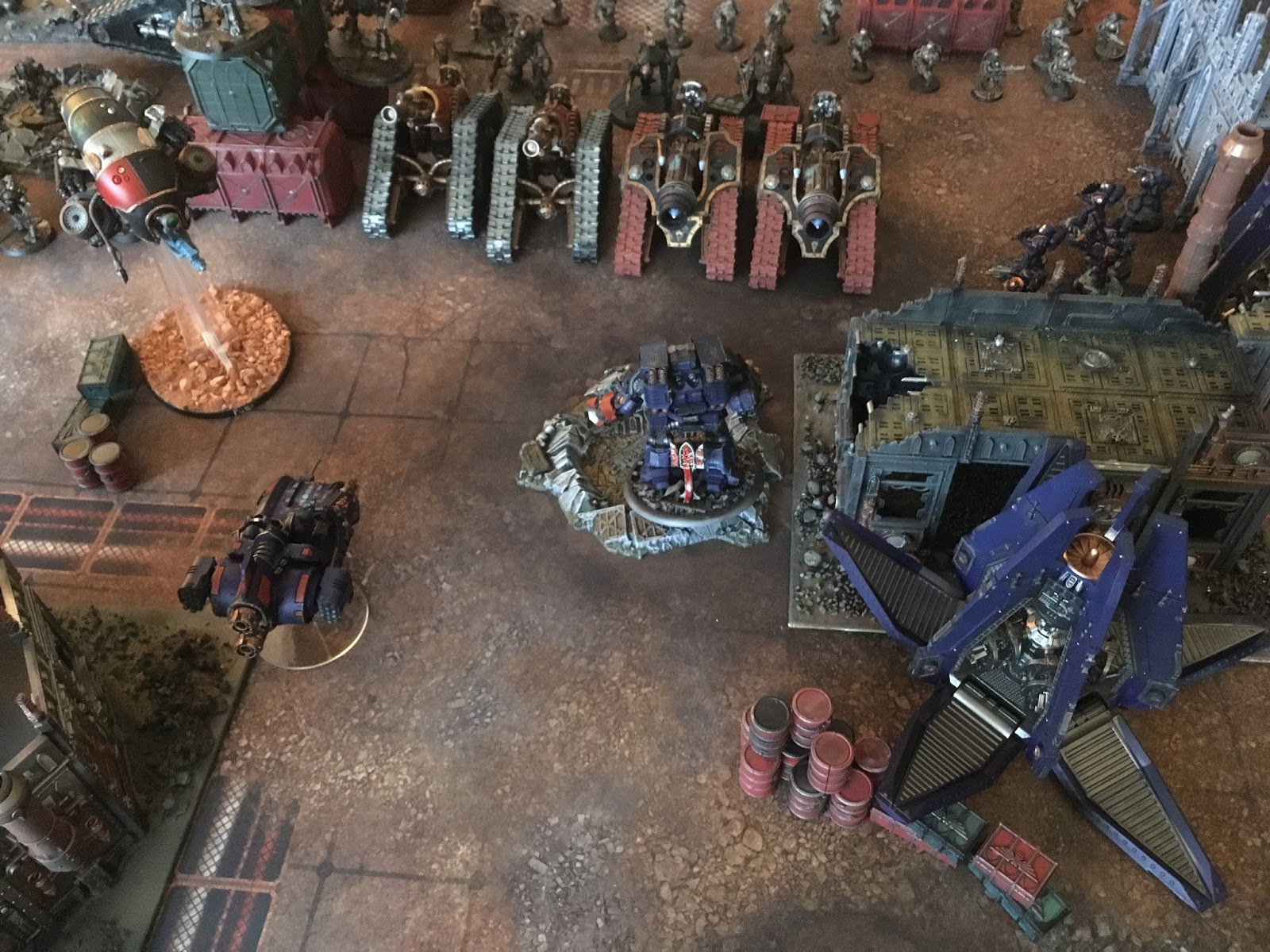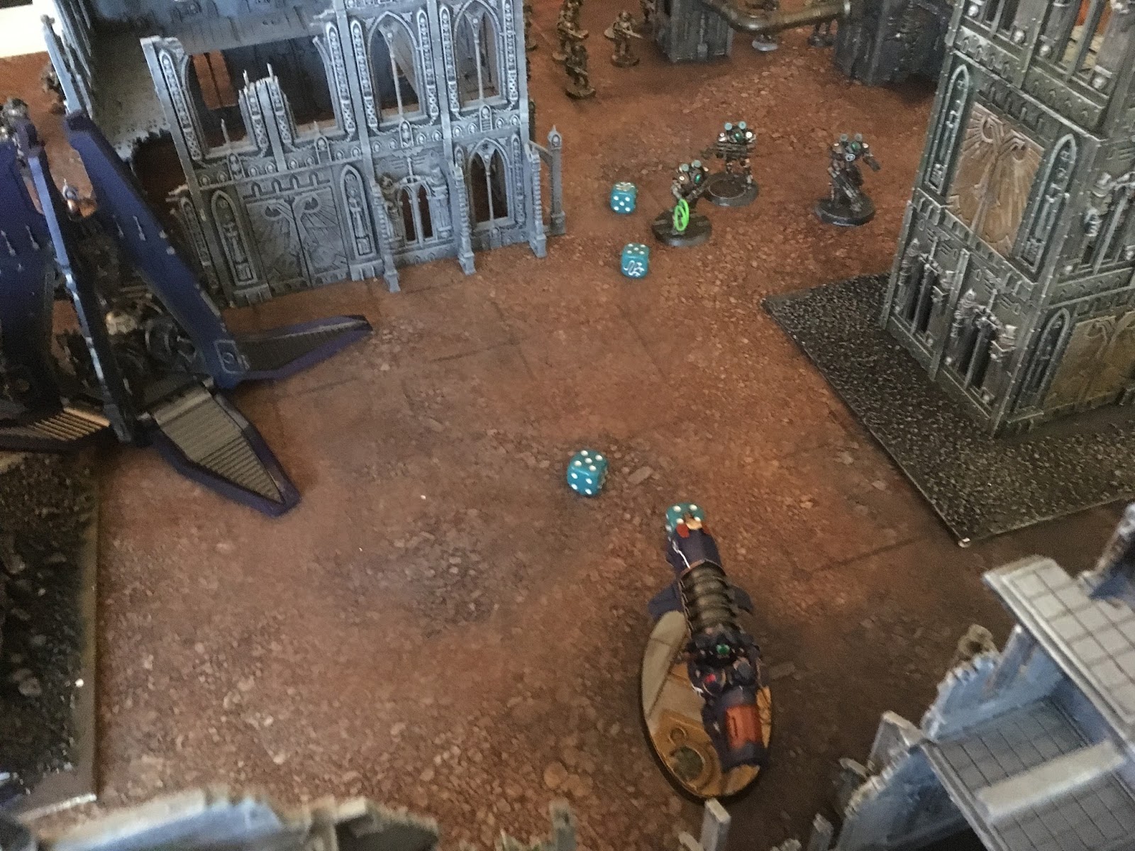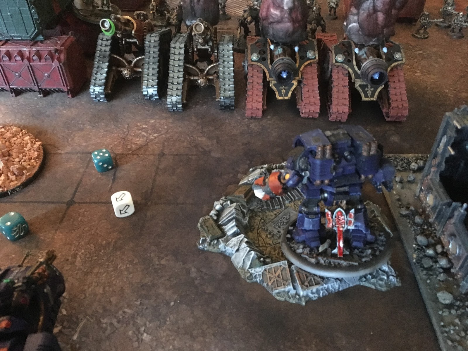 two thanatars with a magos. I underestimated these guys, both the difficulty i would have in clearing them, and the damage output they could do. Particularly as the Magos could let them shoot twice every second turn. And just shoot AP3 bolters the other turns. The Tanks were in squadrons, so i more or less assumed that having that having a leviathan shooting at the one, and having my anti tank vets shooting at the other one might resolve some of my problems.