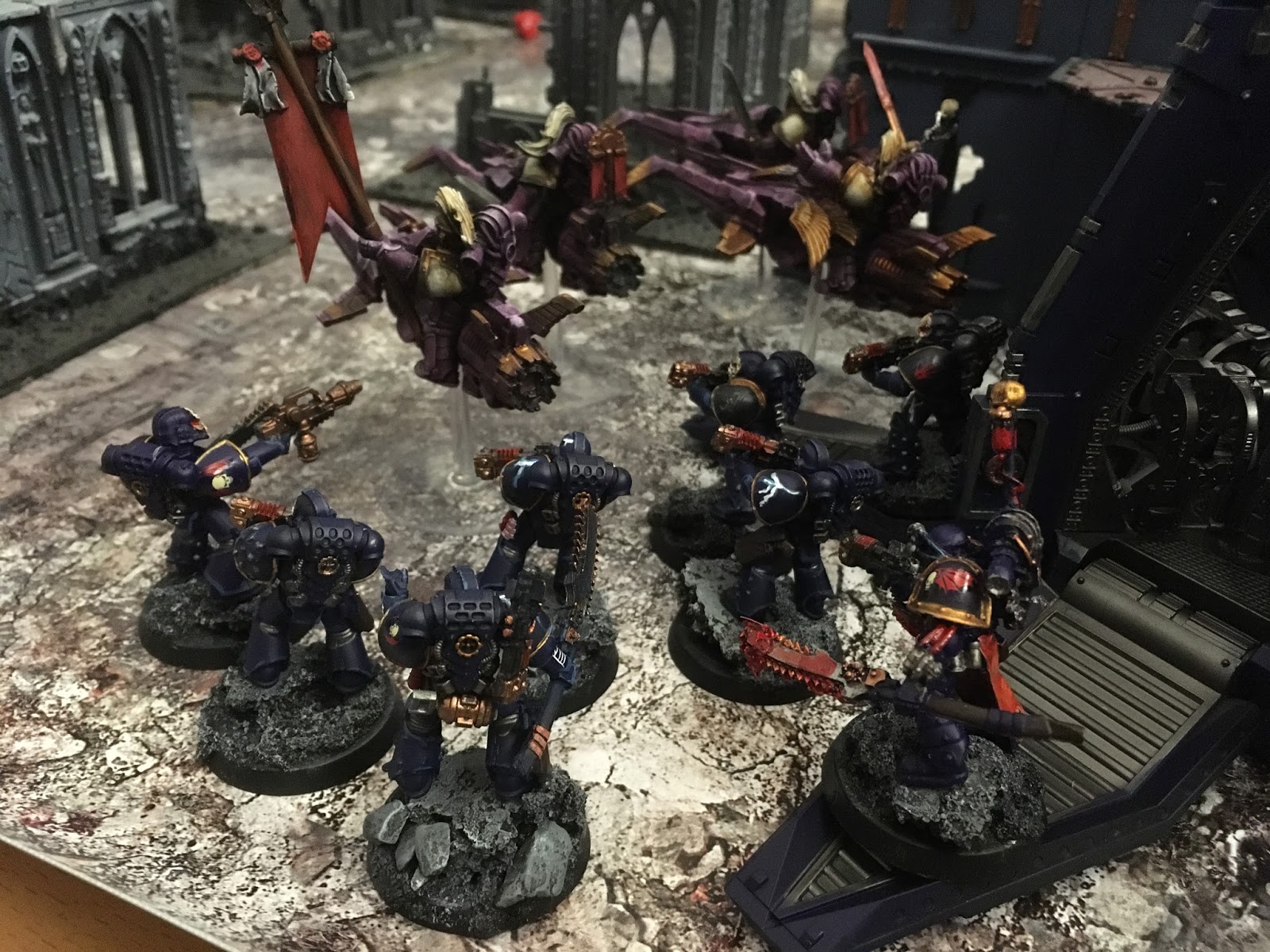 Meanwhile my melta veterans ran into cover, and levelled their combiguns at the bikes, their melta guns having difficulties to find targets as the bikes turned from right to left. Meanwhile the Anvilus flew over the Cults burning away another six cultists, and burning another two from the entrenched marines in the ruins ( realizing that i needed to take his side or at least deny it) My last squad of terror marines descended on the left side of the battleboard.