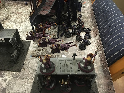 On his second turn the praetor crossed the T and charged my terror squad, while his second jetbike squad opened up on my rapiers, accomplishing two wounds after combining their fire with the Heavy support team.