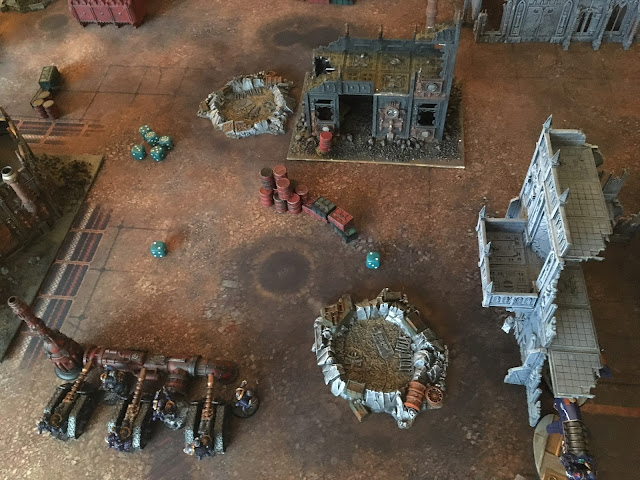 i concentrated into a corner, and after having deployed i used my Warlord trait to move my deployed terror marines into reserves ( i always get this one and i really despise it). as per the Terror assault Rite of War i then rolled my die, assured i would get night fighting (on a 2+) and rolled a one. We're off to a sterling start.