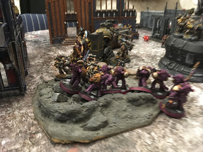 Meanwhile my infiltrating group of terror marines take up positions in cover to start deleting his thralls holding his objective trying to force him to spread his units out.